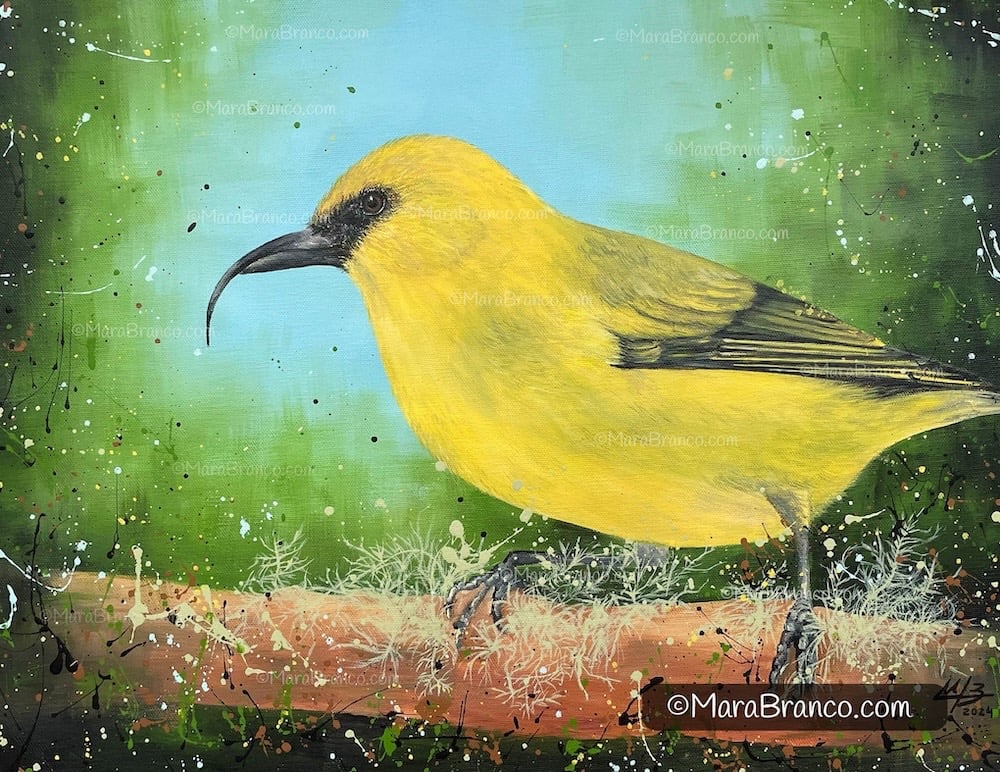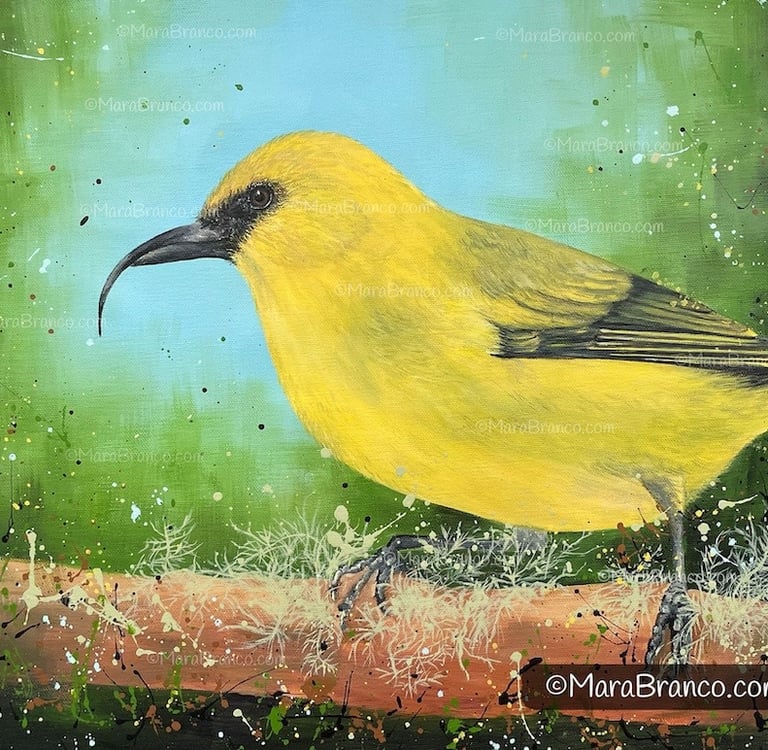 This painting seeks to capture the vibrant hues of the ʻAkiapōlāʻau amidst its lush forest habitat, celebrating its resilience while reminding us of nature's fragility.