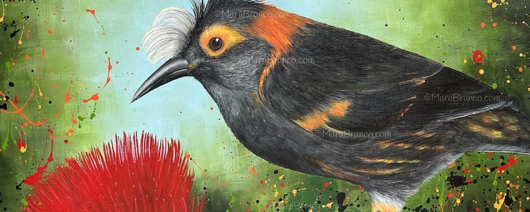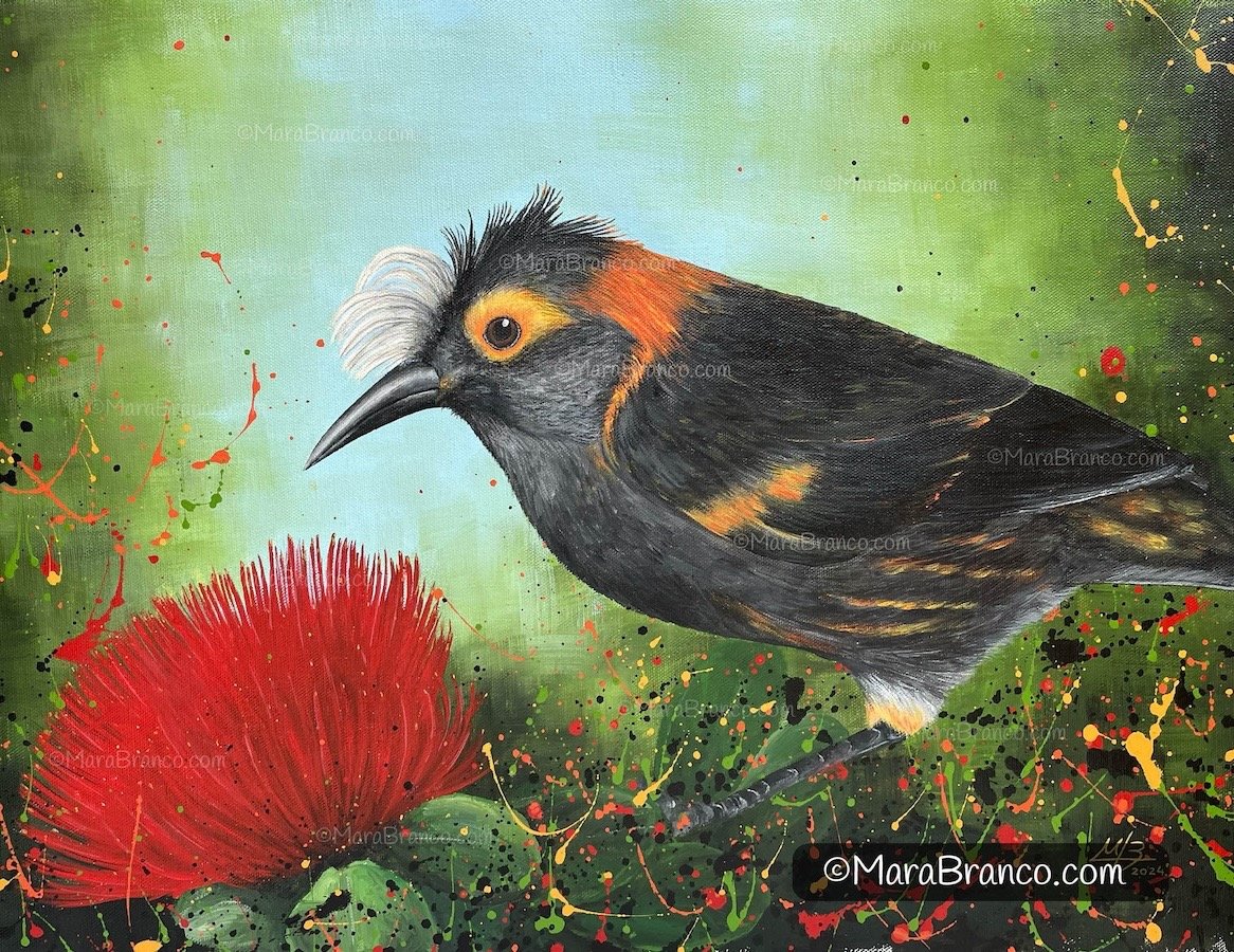 This painting captures the distinct beauty of the ʻĀkohekohe, the crested honeycreeper known for its vibrant colors and distinctive crest.