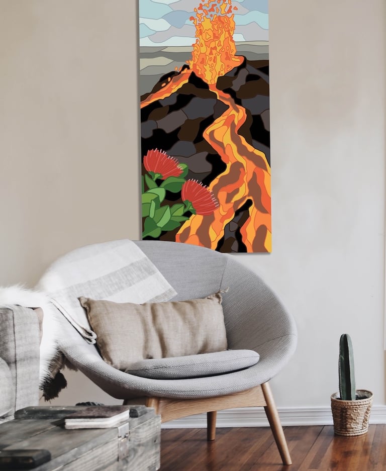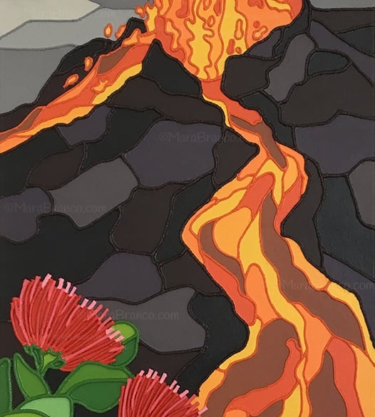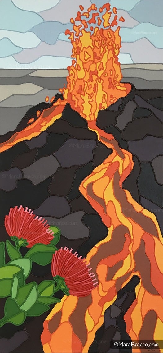 The Big Island of Hawaiʻi is distinguished by its active volcanoes, with Kīlauea being a notable example. The “Kīlauea” painting pays homage to the unexpected eruption of May 2018, which dramatically altered the island’s landscape and profoundly affected many families. Kīlauea was the world’s longest continuously erupting volcano until its lava flows ceased in the fall of 2018.