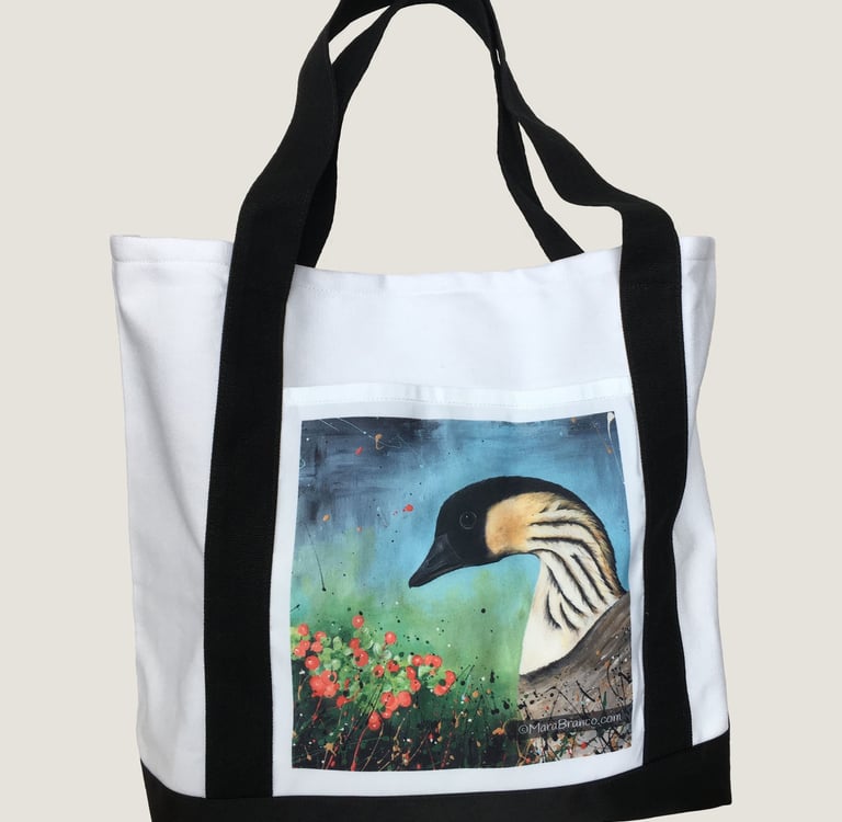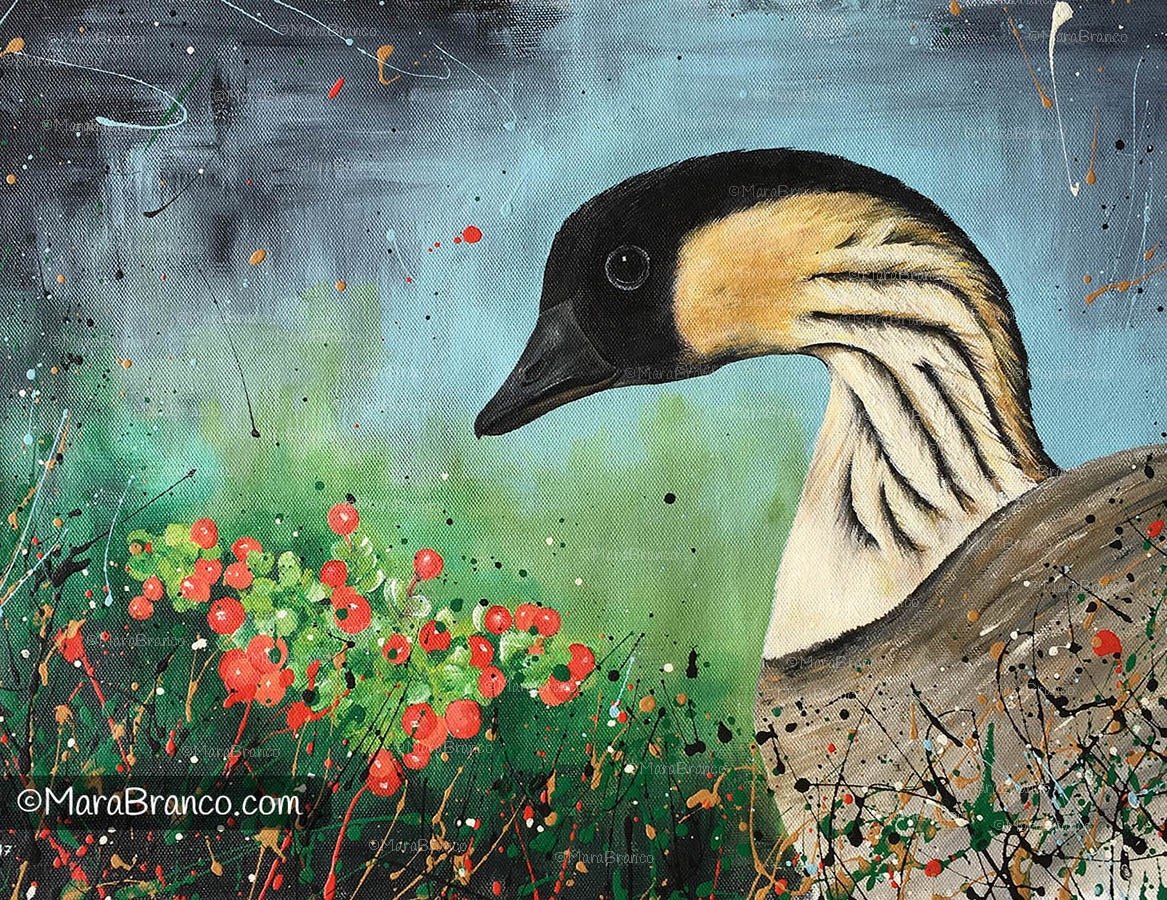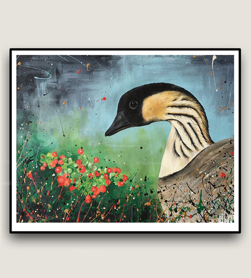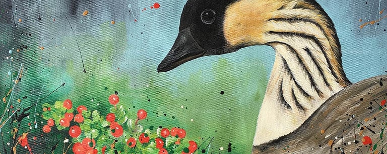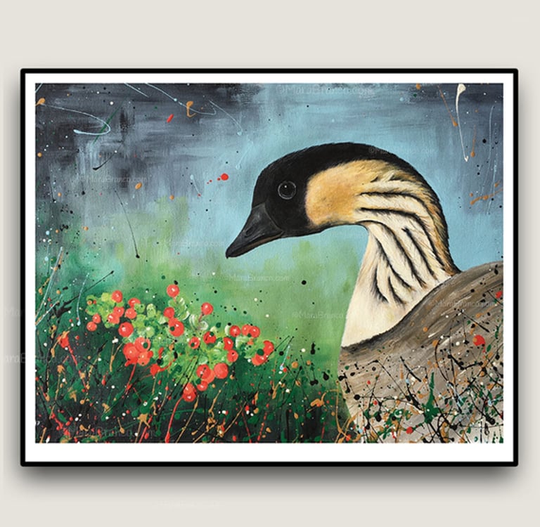 Inspired by my passion for endemic Hawaiian birds, I began a collection that highlights their beauty and significance. My journey started with a commission to paint the I'iwi, but I felt compelled to broaden my focus. Recently, I created a painting of the nene, the Hawaiian state bird, which holds a vital role in the island's ecosystem. The nene, recognized for its striking appearance, enjoys feasting on the berries of the ohelo 'ai, a small shrub also native to Hawaii and featured in my artwork. Through this piece, I aim to raise awareness about these unique species and the delicate environment they inhabit, encouraging others to appreciate and protect Hawaii's natural treasures.